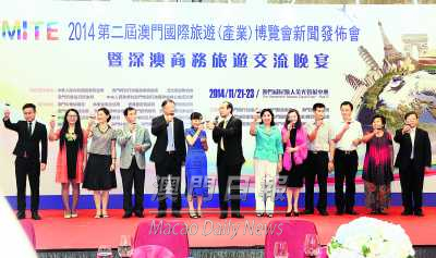 本屆旅博會(huì)組委會(huì)昨晚在深圳舉行新聞發(fā)佈會(huì)暨深澳商務(wù)旅遊交流晚宴,介紹相關(guān)籌備情況。澳門旅行社協(xié)會(huì)會(huì)長劉雅煌、深圳市文體旅遊局副局長楊永群、廣東省僑聯(lián)副主席孔愛玲、深圳市僑聯(lián)主席馬勇智等,以及深澳兩地各大旅行社和業(yè)界協(xié)會(huì)代表等約一百六十人與會(huì)。
