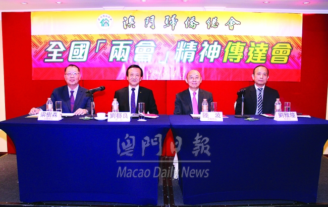 澳區(qū)全國(guó)人大代表劉藝良、陸波,澳區(qū)全國(guó)政協(xié)委員梁樹森、劉雅煌,本月三日晚在皇都酒店會(huì)議室向僑總及澳門僑界社團(tuán)負(fù)責(zé)人傳達(dá)全國(guó)“兩會(huì)”精神,闡釋修憲的重大意義和重要內(nèi)容,並向一百四十多位與會(huì)者派發(fā)《中華人民共和國(guó)憲法》,呼籲僑界細(xì)讀憲法、理解憲法、維護(hù)憲法權(quán)威。