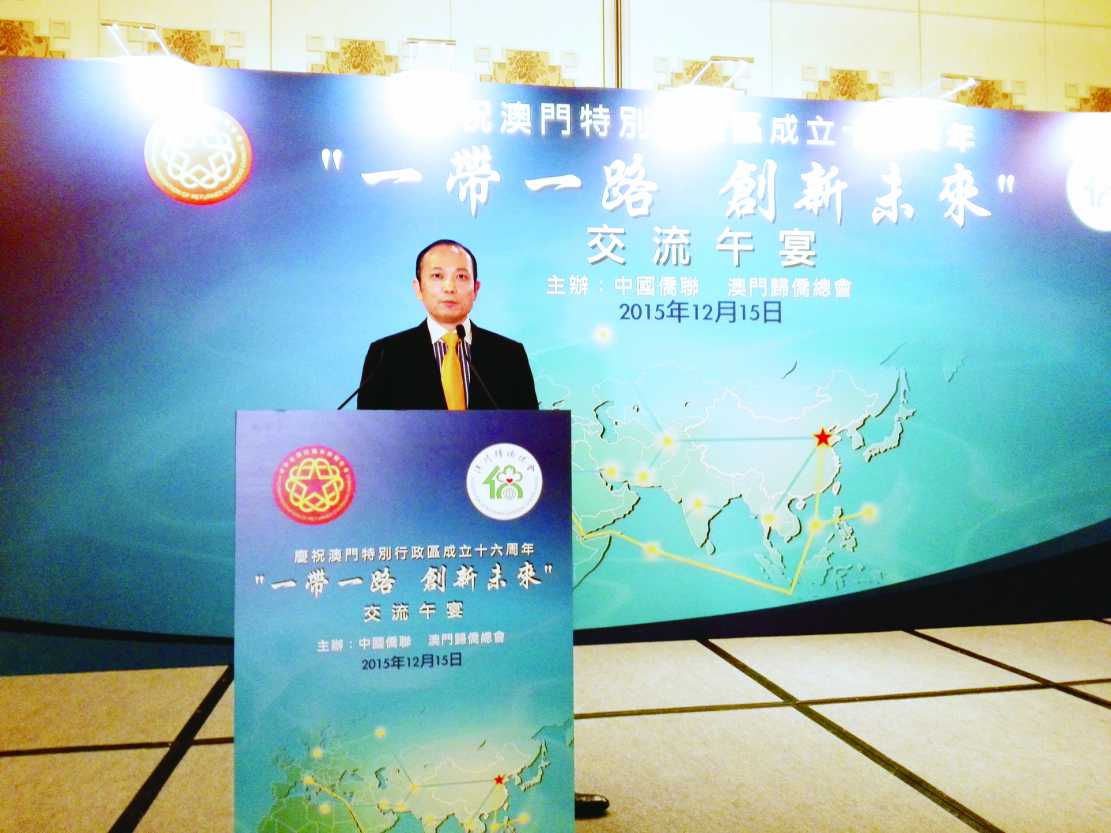 【本報(bào)訊】中國僑聯(lián)、澳門歸僑總會(huì)合辦“一帶一路 · 創(chuàng)新未來”專題講座後,即設(shè)午宴款待出席的專家和學(xué)者。全國政協(xié)委員、僑總監(jiān)事長、萬國控股集團(tuán)主席劉雅煌認(rèn)為,未來全球發(fā)展離不開創(chuàng)新,面對複雜嚴(yán)峻的國內(nèi)外發(fā)展環(huán)境和宏觀經(jīng)濟(jì)下行壓力下,國家應(yīng)堅(jiān)持以創(chuàng)新力量驅(qū)動(dòng)發(fā)展戰(zhàn)略,大力推進(jìn)“大衆(zhòng)創(chuàng)業(yè),萬衆(zhòng)創(chuàng)新“。