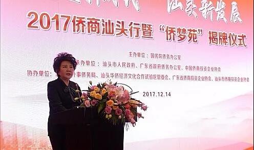 裘援平在儀式上講話指出,習(xí)近平總書(shū)記在黨的十九大報(bào)告當(dāng)中描繪了未來(lái)幾十年中國(guó)的發(fā)展藍(lán)圖,號(hào)召海內(nèi)外中華兒女共擔(dān)民族復(fù)興的歷史責(zé)任,共享祖國(guó)繁榮富強(qiáng)的偉大榮光。她希望汕頭借助僑夢(mèng)苑,打好“僑牌”及“組合拳”,發(fā)掘、發(fā)揮汕頭經(jīng)濟(jì)特區(qū)著名僑鄉(xiāng)優(yōu)勢(shì)、潮汕文化優(yōu)勢(shì)和華僑試驗(yàn)區(qū)的綜合平臺(tái)作用;建立健全“僑夢(mèng)苑”工作體系,梳理匯總各類普惠和惠僑政策,建立健全更加開(kāi)放、更有針對(duì)性、更具吸引力的鼓勵(lì)華僑華人投資興業(yè)、創(chuàng)新創(chuàng)業(yè)制度,讓投資者放心、安心、有信心;重點(diǎn)構(gòu)建為僑服務(wù)體系,在政策服務(wù)、生活服務(wù)、事業(yè)發(fā)展服務(wù)等各方面,疏通渠道、搭建平臺(tái)、創(chuàng)造條件、給予幫扶,努力營(yíng)造推動(dòng)干事創(chuàng)業(yè)的良好環(huán)境。