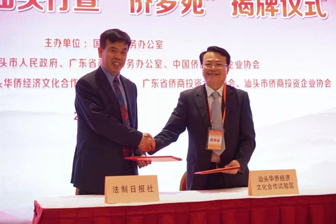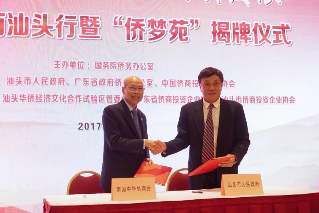 儀式上,裘援平和林積為汕頭“僑夢(mèng)苑”揭牌。隨后,舉行了兩個(gè)項(xiàng)目的簽約活動(dòng):汕頭市人民政府與泰國(guó)中華總商會(huì)簽訂中泰(汕頭)華僑中心項(xiàng)目協(xié)議;華僑試驗(yàn)區(qū)管委會(huì)與法制日?qǐng)?bào)簽訂合作框架協(xié)議。