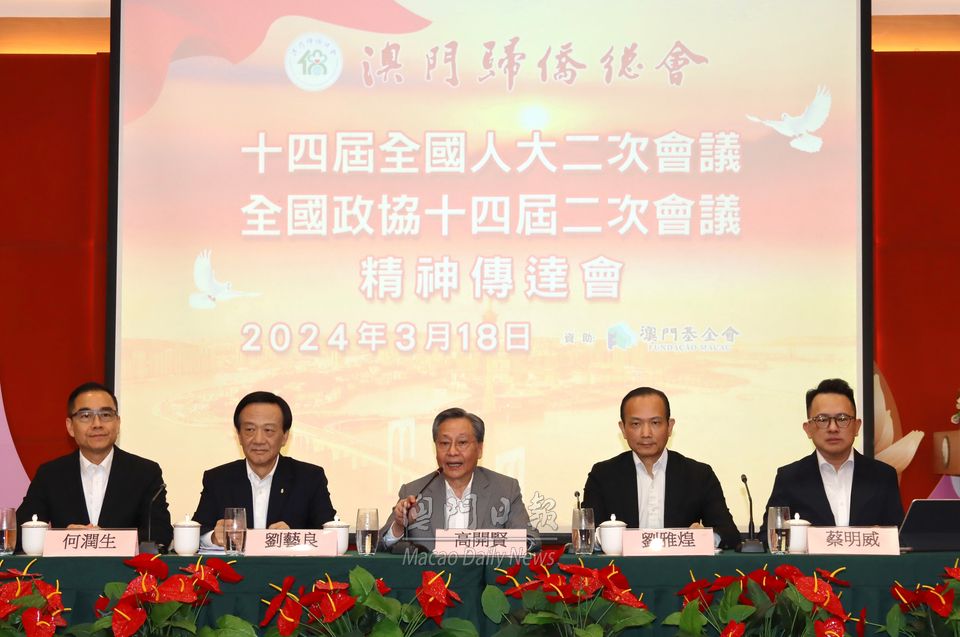 【澳門日報消息】澳門歸僑總會於周一下午三時半在會址召開“全國兩會精神傳達會”。全國人大常委高開賢,全國政協(xié)常委何潤生,澳區(qū)全國人大代表團團長、僑總永遠會長劉藝良,全國政協(xié)常委、僑總會長劉雅煌,全國政協(xié)澳區(qū)委員、僑總副會長蔡明威分別講述在兩會期間的工作重點及體會。