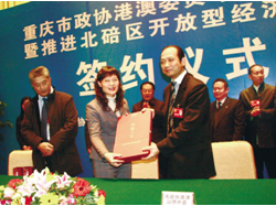 重慶市政協(xié)三屆三次會(huì)議圓滿閉幕。會(huì)議期間,為積極響應(yīng)重慶市委關(guān)於市政協(xié)委員助推區(qū)縣經(jīng)濟(jì)社會(huì)發(fā)展的號(hào)召,港澳臺(tái)僑外事委員會(huì)副主任、澳門萬(wàn)國(guó)控股集團(tuán)主席劉雅煌代表重慶市政協(xié)港澳臺(tái)僑外事委員會(huì)與重慶市北碚區(qū)政府簽署了《共同推進(jìn)北碚區(qū)開放型經(jīng)濟(jì)發(fā)展合作備忘錄》,共同推進(jìn)北碚區(qū)開放性經(jīng)濟(jì)跨越式發(fā)展。澳區(qū)重慶市政協(xié)委員徐偉坤、李炳康、袁松山、邱金海、曾藝、朱鐵能等出席了簽約儀式。